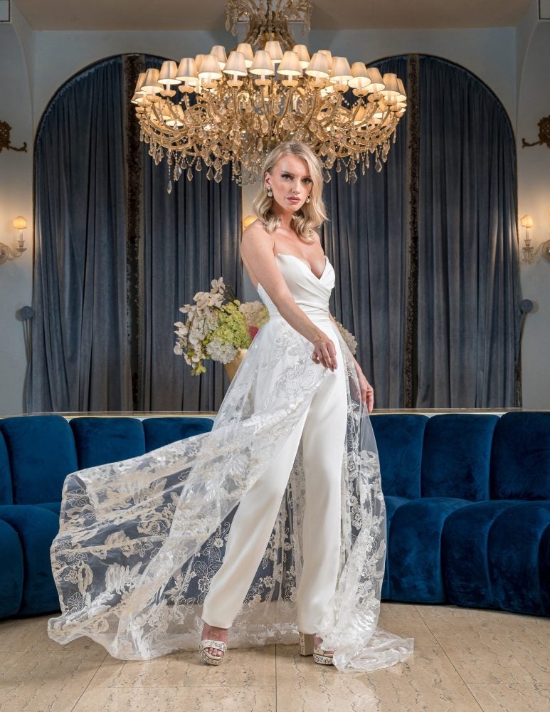 A bridal jumpsuit is an ideal choice for the modern bride seeking a comfortable, functional, and fashion-forward ensemble for the big day. While it is an effortless look, measurements are essential in order to ensure the length of the torso and pant length are of the appropriate proportions. We suggest consulting with your personal bridal stylist to learn more about the best fit and fabric for your specific body type and individual preferences.