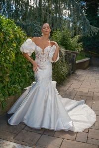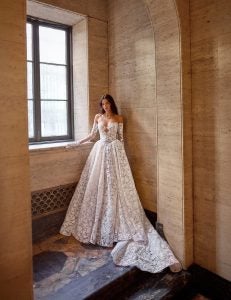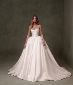 Of course, we can’t talk about wedding dresses without mentioning romance. Romantic wedding dresses align beautifully with other bridal styles or aesthetics including rustic wedding dresses, boho bridal gowns, and fairytale wedding dresses. Whimsical wedding dresses as well as feminine bridal gowns also fall within this popular category. Similarly, the emergence of garden party or cottagecore aesthetics go hand-in-hand with romantic bridal gowns.