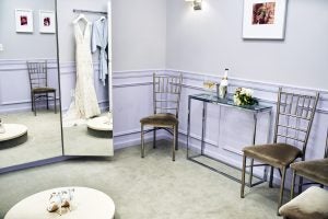 Once your guests are seated amongst your viewing area equipped with a mirror, pedestal, lounging space, as well as an assortment of beverages and light bites, your personal bridal stylist will escort you to a private dressing room.