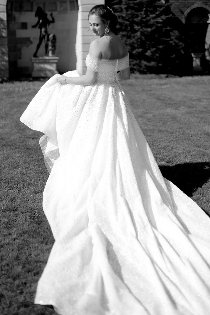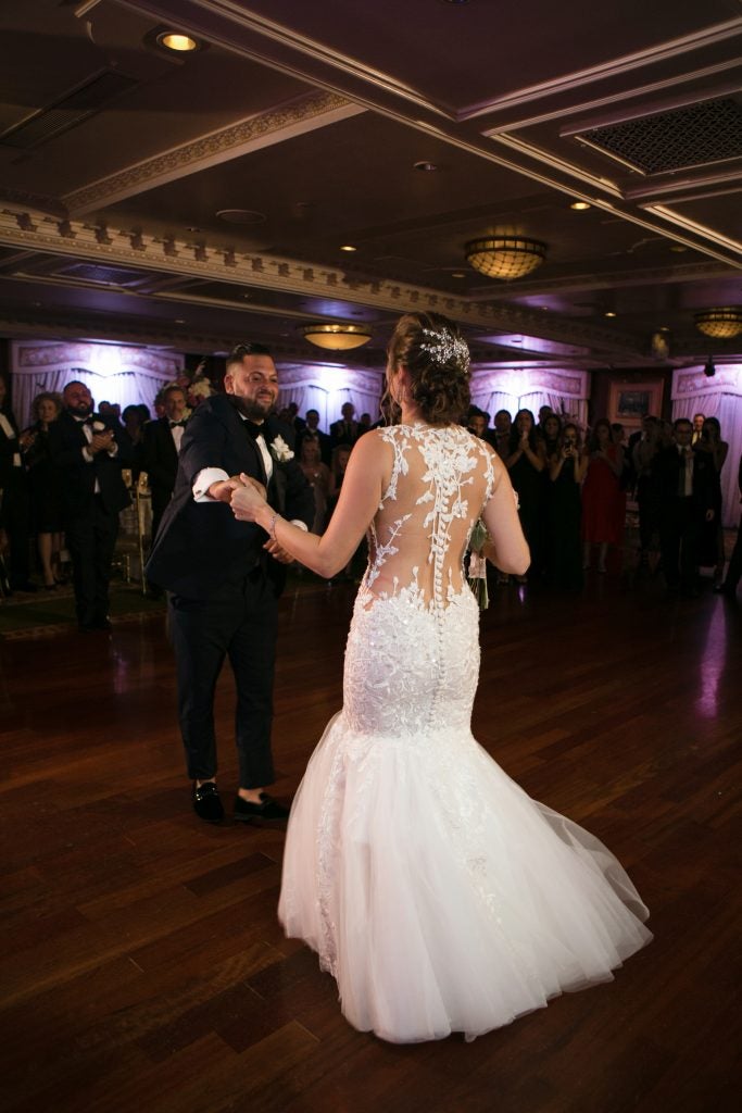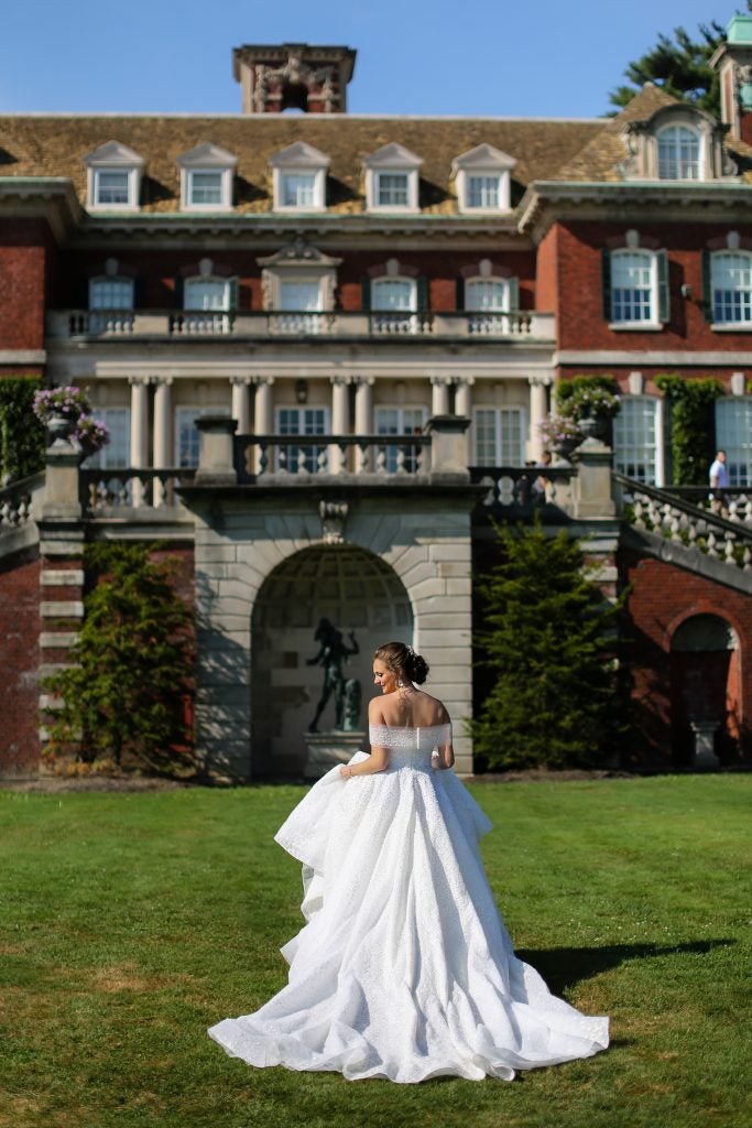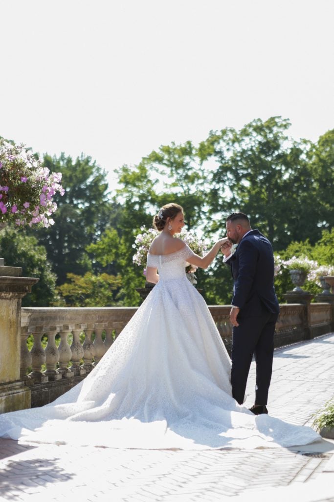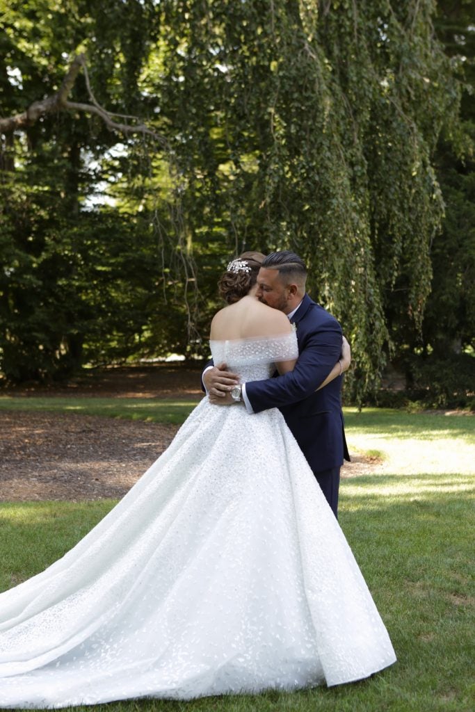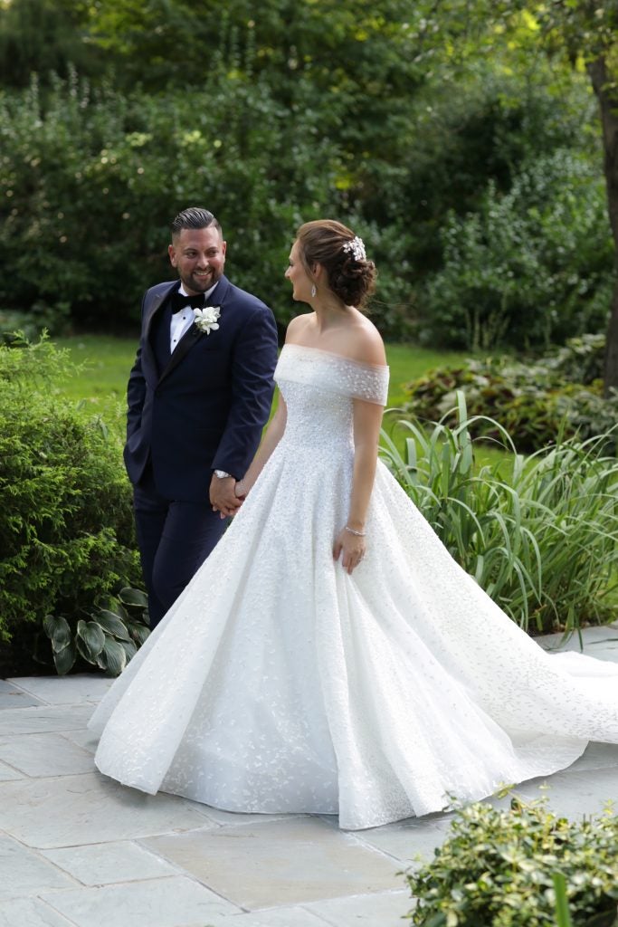 My vision was not originally a ball gown, but Tony insisted I try on this gown. When I put it on I didn’t know what to think. It was so big and not what I envisioned but when I saw it on I fell in love. It was just so elegant and the portrait collar gave it a different feel than the typical ball gown. My mother and mother-in-law to be fell in love as well.