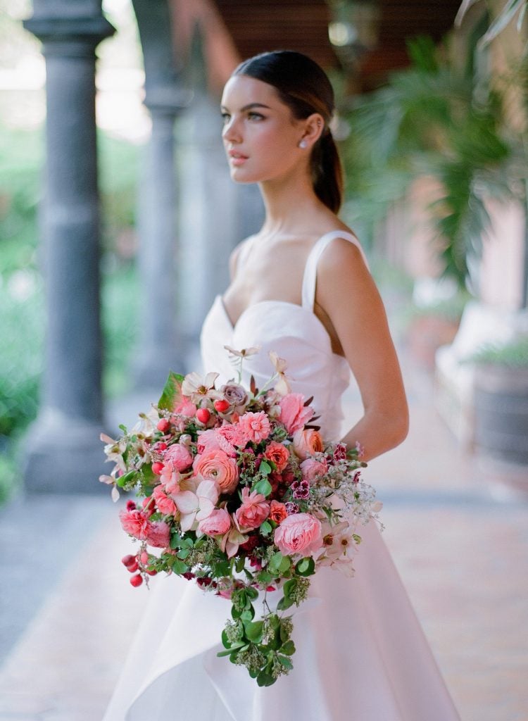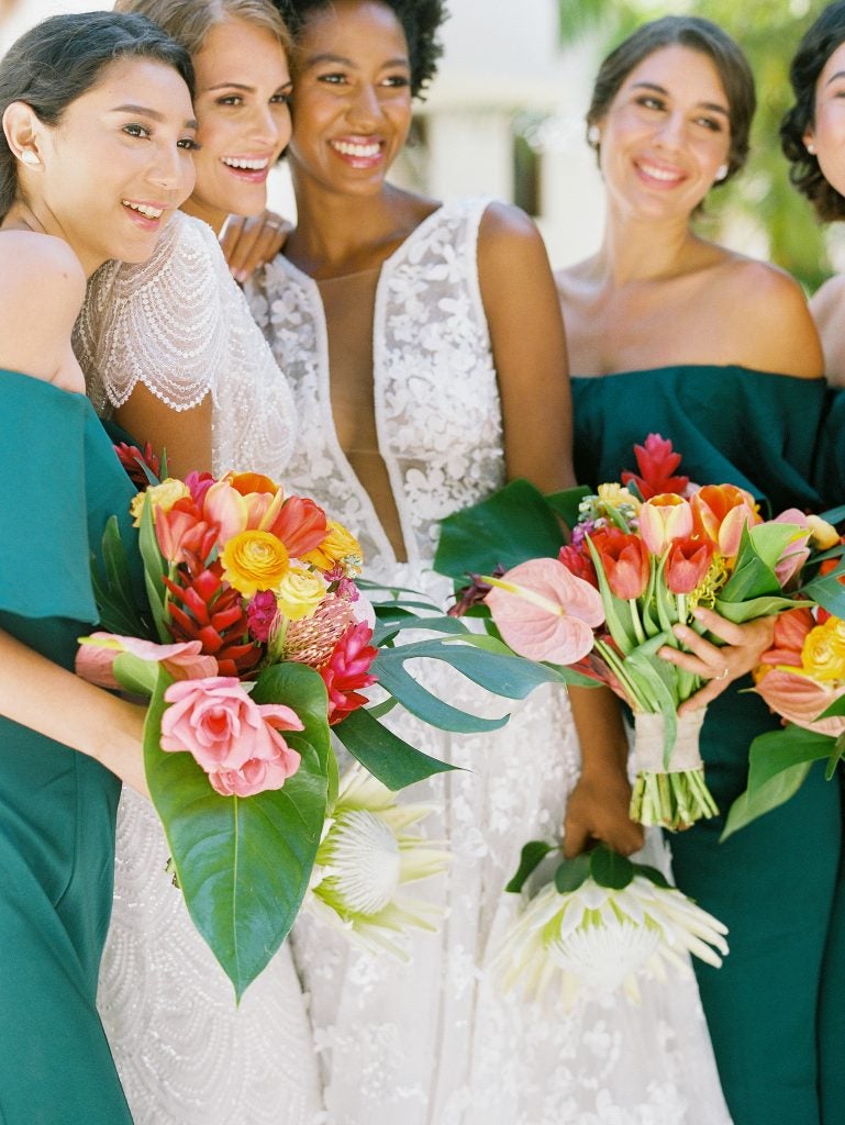 Love these bright, compact arrangements? Ask your florist for ranunculus, anthuriums, leuco, gingers and roses, as created by florist Vanessa Jaimes Floral Design. When asked to create bouquets for a tropical wedding destination photo shoot (see more here), Vanessa says she tried to “design a couple of bouquets with a more classic look, so people can see that even here in a tropical setting, you can always use elegant and classic flowers as well,” Looking for a mix of both beachy and traditional? Stick with classic flowers like roses and ranunculus, but in fun, vibrant colors.