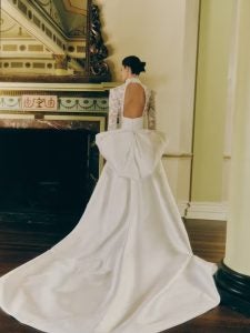 Exuding chic sophistication, this high-neck long sleeve fit-and-flare gown is ideal for a late fall or winter celebration. Plus, that open keyhole back and statement-making bow?! It’s a look that speaks for itself.