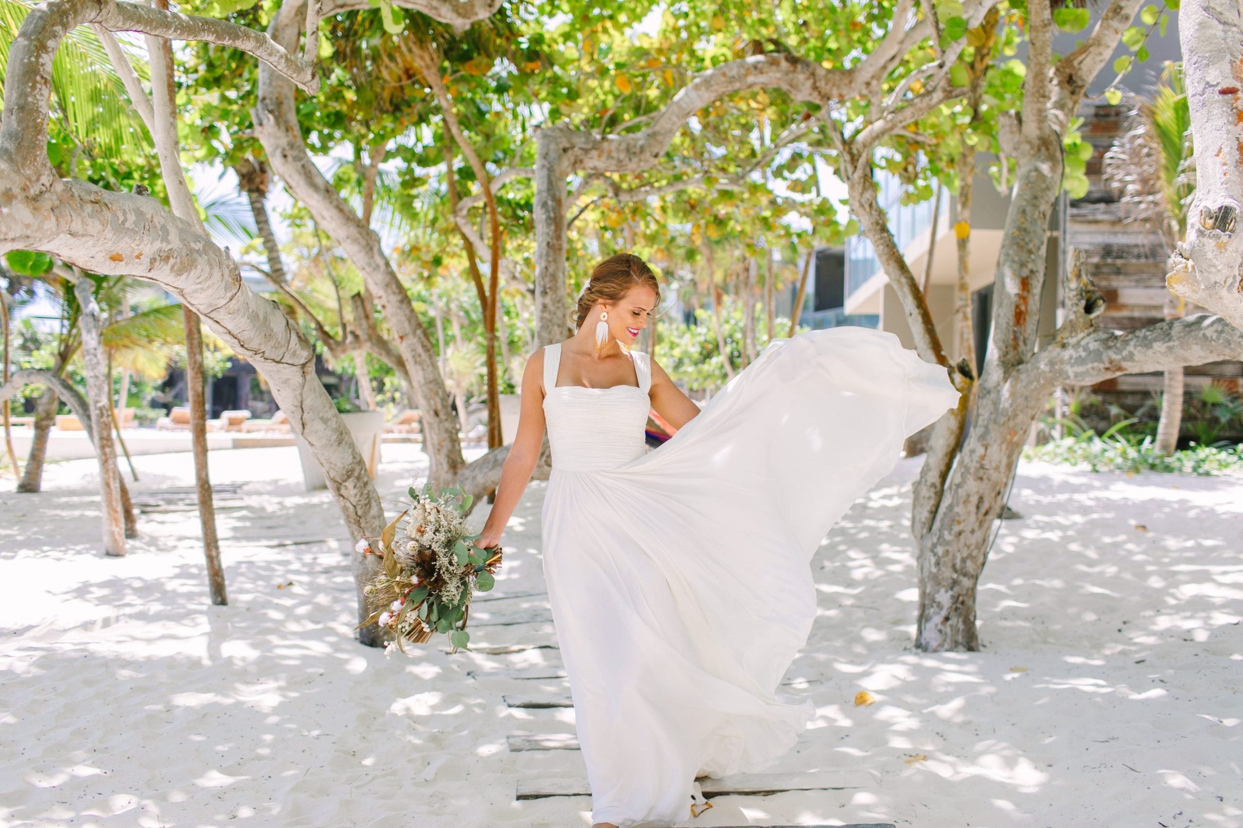 Dresses with raised backs or corsets make great options for bustier brides. This way, a bra can be worn without it being seen, plus a corset can be adjusted as needed for extra support. Bonus: corseted bodices will cinch and highlight your waist really well.