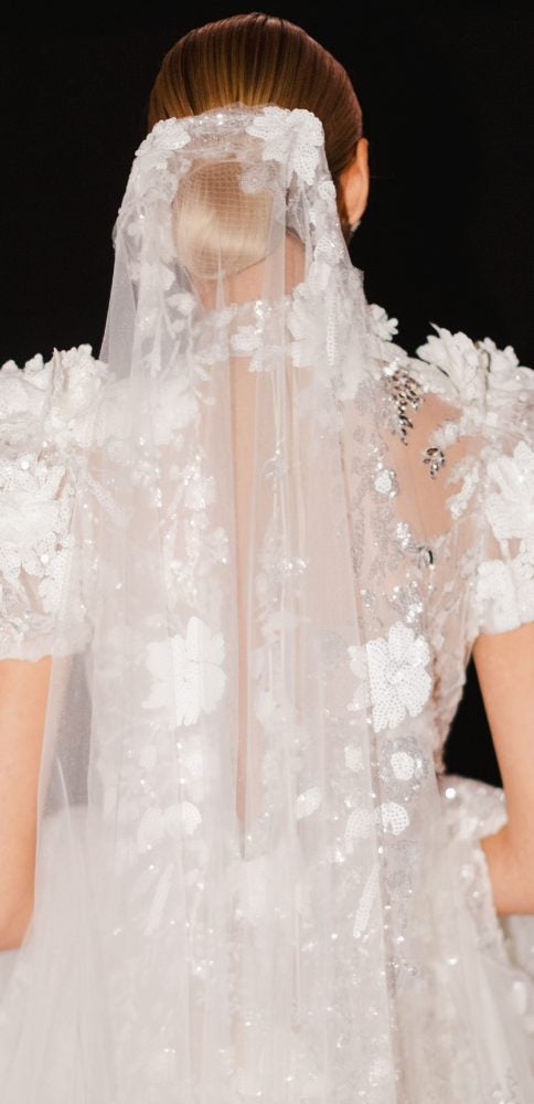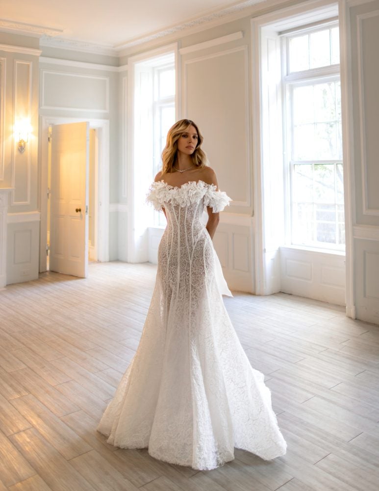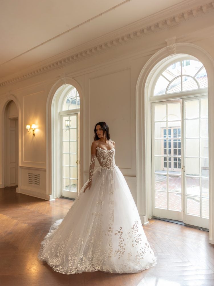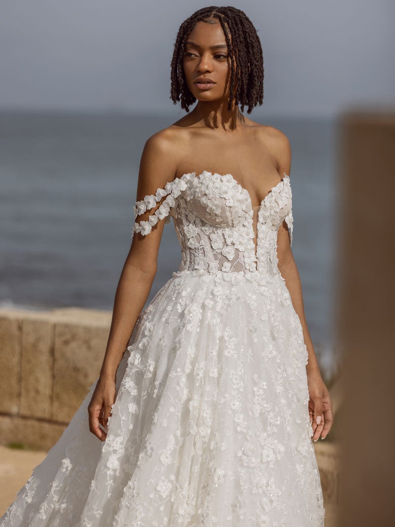 Distinct elements such as her figure-sculpting mermaid and fit-and-flare silhouettes, sparkling embellishments, internationally-sourced laces, pointed long trains, and of course, her over-the-top, architecturally-inspired ball gowns are what make her most popular styles irresistible.