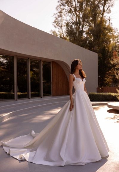 The ultra dramatic and voluminous nature of the ball gown silhouette may be physically and visually overwhelming for petite brides. Design elements, such as elongating princess seams, open necklines, and more dainty embellishments, are just a few of the features that cater well to a more petite frame. We recommend consulting with your personal bridal stylist to discover the ball gown wedding dress that equally showcases the beauty of the dress and the bride wearing it!