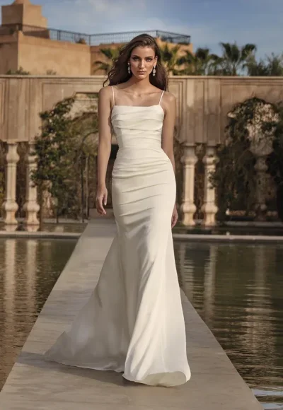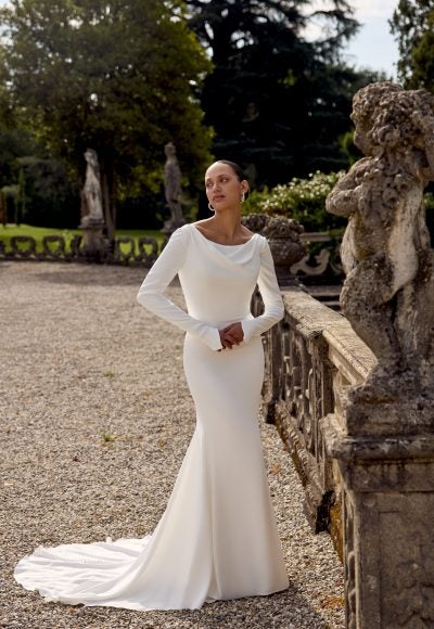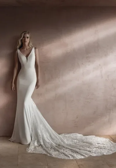 Due to its balanced proportions, a fit-and-flare wedding dress suits a variety of body types. Whether you have an hourglass shape, a more athletic or thin build, the silhouette naturally elongates the body while hugging or creating the illusion of curves. Design elements, such as lace placement and ruching, as well as proportions will also influence the way in which the body appears. Regardless of your specific body type, professional alterations will especially prove to be paramount in achieving a seamless fit.