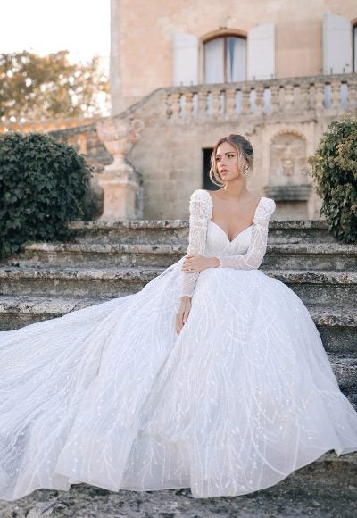 When considering a sparkly wedding dress, be mindful of various factors such as the hue that complements your skin tone best, the type of glimmering embellishment you prefer, as well as your desired level of shimmer. Whether you consider yourself a glamorous bride who wants to shine all day and night or you’re seeking more subtle sparkle, our exquisite collection features a diverse range of shimmering styles to choose from. We recommend consulting with your personal bridal stylist to discover the best sparkly bridal look for you!