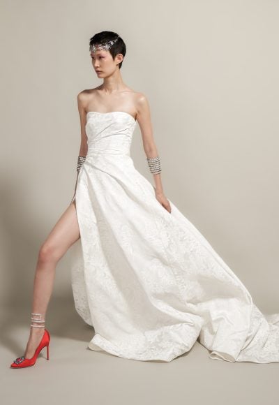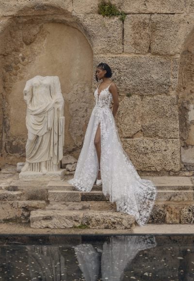 You’re in luck! There are several variations of wedding gowns with slits to accommodate all brides of varying preferences and personal styles. A-lines or ball gowns featuring box pleats with a side slit will provide effortless mobility and visual fluidity. Fitted gowns expose the leg a bit more in comparison to slits paired with fuller skirts. A dress with a center slit or a gown displaying two slits on either side of the skirt convey a more daringly avant-garde look. Similarly, the height of the slit influences the overall vision. Thigh-high slits are tastefully sexy and playful while ones falling below the knee are much more subtle.