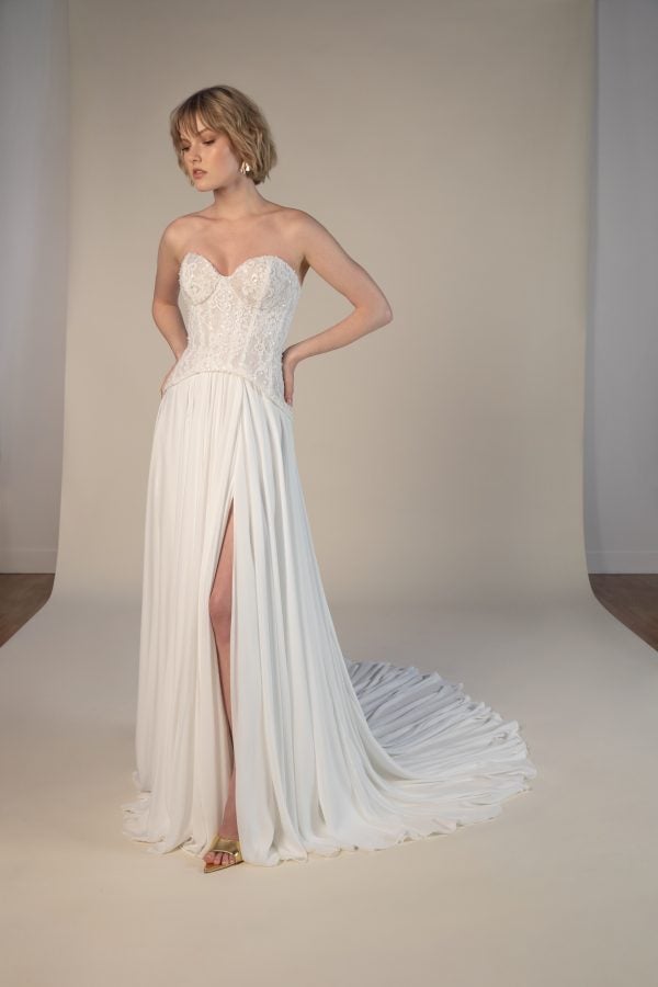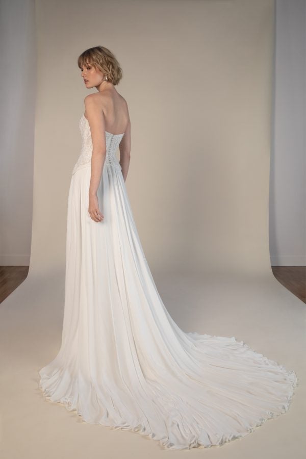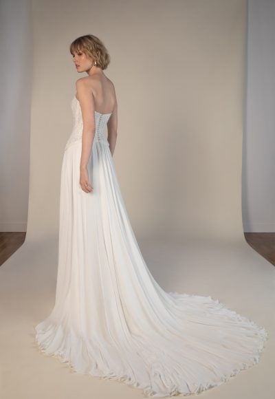 This contemporary yet vintage-inspired A-line gown features a strapless cut and sculpted sweetheart neckline that elegantly frames the décolletage. Expertly crafted with embellished floral lace, the sheer corset bodice sculpts the upper body before meeting a uniquely-cut dropped waistline. An effortless silk chiffon skirt with a slit flows into a breathtaking train while a simple row of fabric-covered buttons completes this romantic bridal look.