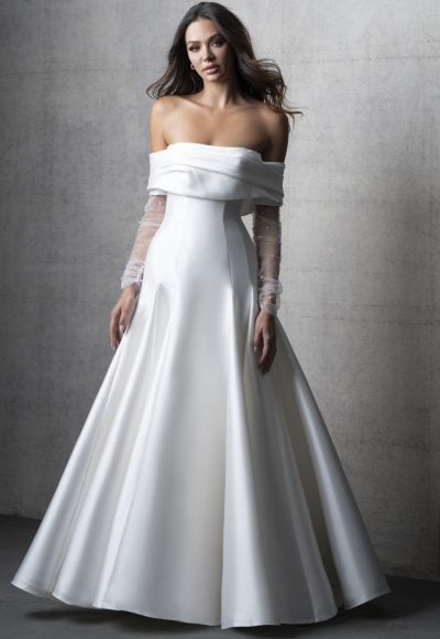 Chic and simple, this modified A-line gown features a strapless cut and subtly scooped, cat-eye neckline. Crafted with silk Mikado fabric, princess seams complement the structured bodice and sleek silhouette before flaring out into an aisle-worthy skirt. Instantly elevate this timeless bridal look with its detachable bardot topper that elegantly frames the décolletage. Sheer, pearl-adorned, tulle sleeves add a romantic touch that is bound to be remembered.