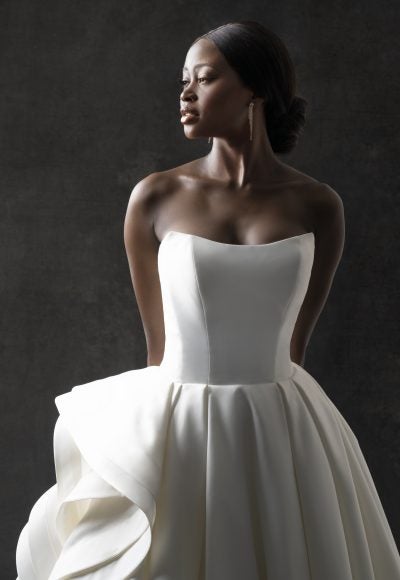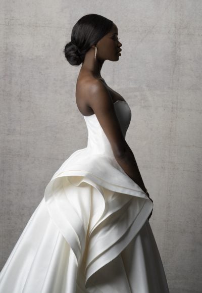 This stunningly architectural ball gown features a strapless cut and contemporary cat-eye neckline that elegantly frames the décolletage. Crafted with silk Mikado, the sleek bodice defines the waist before erupting into a grand, asymmetrical skirt. The luxurious fabric is beautifully manipulated to create dramatic, unforgettable pleating on one side of the full skirt.