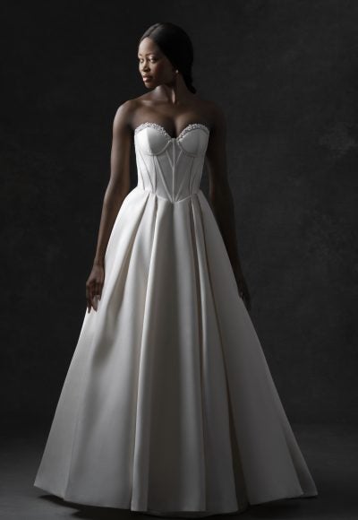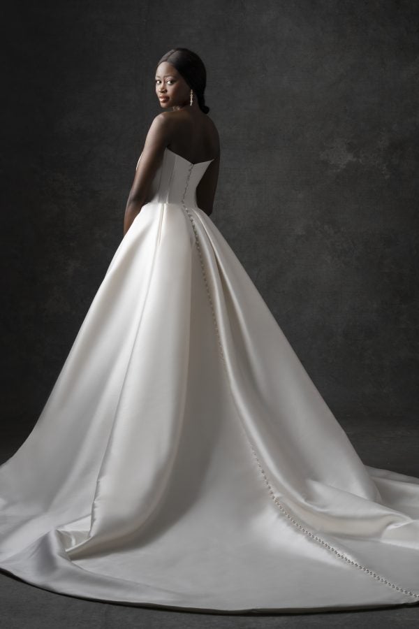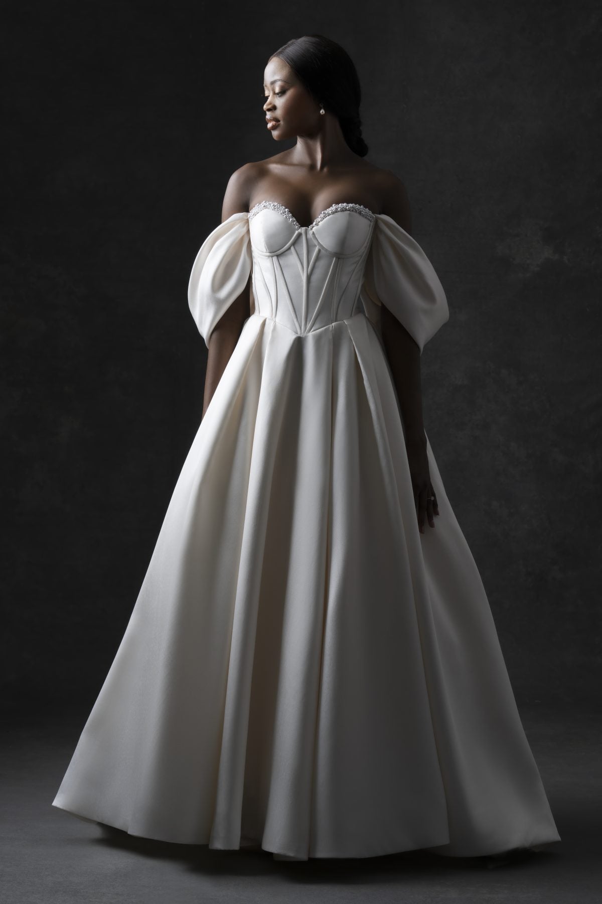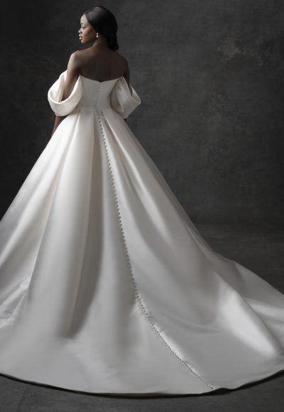 This chic and unexpected ball gown features an elegant strapless cut met by a contemporary sweetheart neckline that cascades into voluminous, detachable off-the-shoulder sleeves. The defined corset bodice showcases intricate pearl embellishment as well as exposed boning. Expertly crafted with silk Mikado fabric, the pleated, full skirt flows into a breathtaking train complete with a row of fabric-covered buttons.