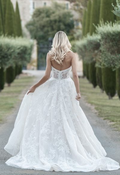 Feminine and romantic, this ball gown features delicate Chantilly lace. The strapless cut is paired with a sweetheart neckline that elegantly frames the décolletage. Embellished lace appliqués create irresistible shimmer from head to toe while the sheer corset bodice effortlessly sculpts the body. To finish, the dreamy, full skirt pairs perfectly with a row of fabric-covered buttons and an aisle-worthy train.