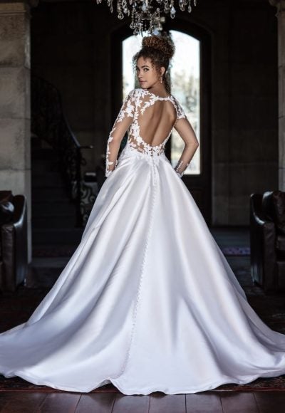 This elegant ball gown features a plunging portrait neckline and illusion long sleeves adorned with floral appliqués that appear to merely float upon the skin. Expertly crafted with delicate Chantilly lace and embellished floral appliqués, the structured bodice flows into a dramatic full skirt crafted with Silk Mikado fabric. Timeless and romantic, a breathtaking key-hole [...]