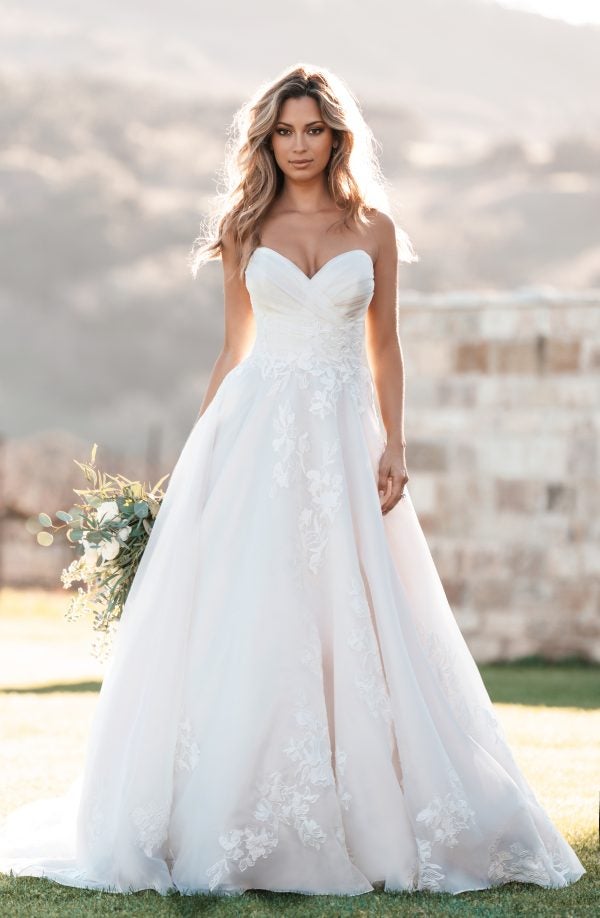 This iconic ball gown features a timeless sweetheart neckline complete with a strapless cut that elegantly frames the décolletage. Intentionally-placed ruching throughout the bodice sculpts the upper body before cascading into delicate floral lace appliqués that scatter throughout the grand silhouette. Fabric-covered buttons complete the exposed back and aisle-worthy, silk organza train.
