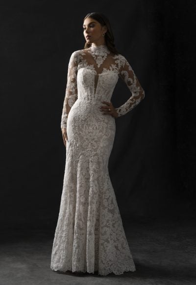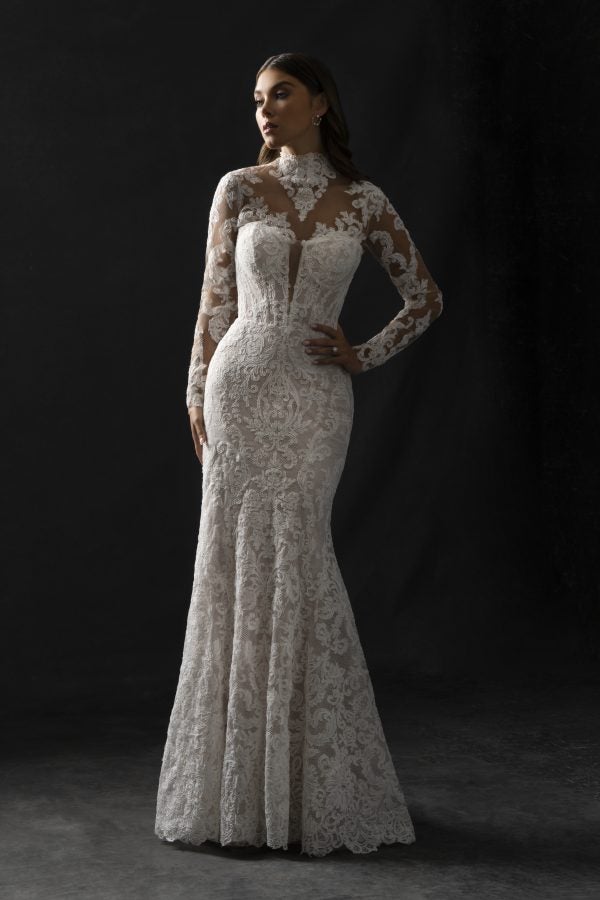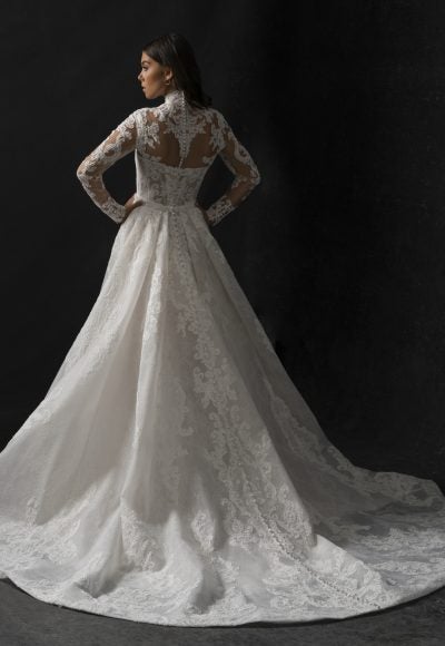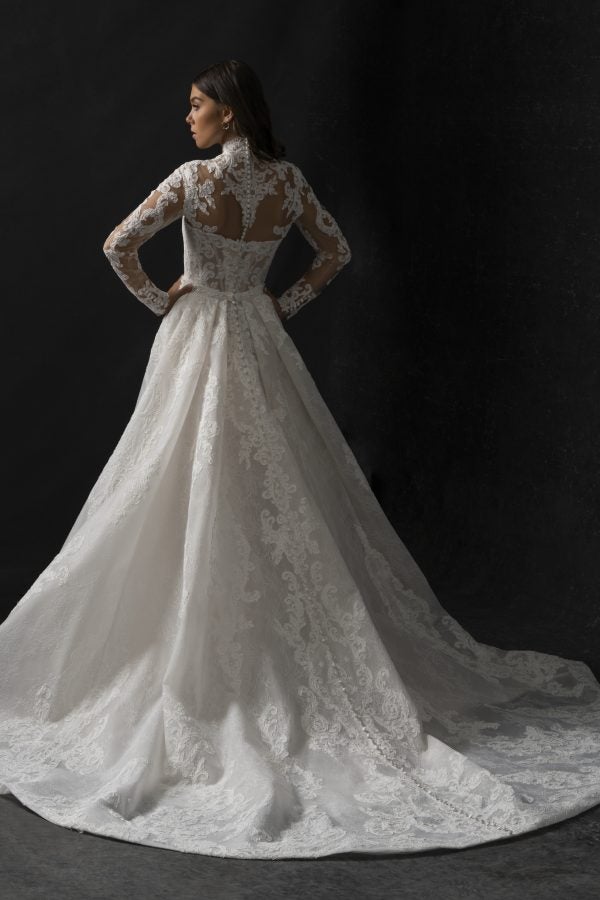 Regal and romantic, this sheath gown features exquisite Alençon lace from head to toe. The strapless, plunging sweetheart neckline elegantly frames the décolletage while the structured corset bodice sculpts the upper body. A row of fabric-covered buttons cascades into the beautiful lace train. Instantly elevate this classic bridal look with the gown's high-neck, long sleeve, [...]