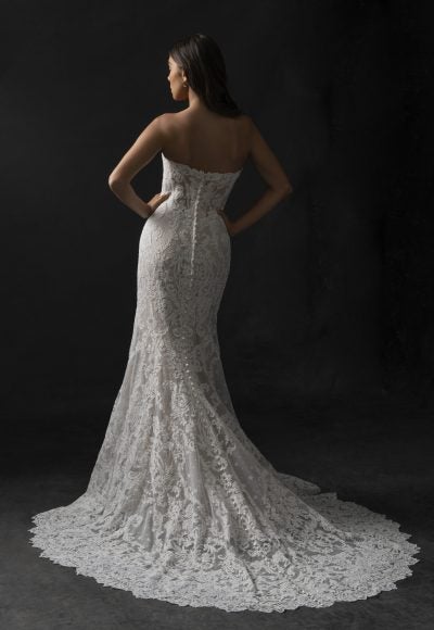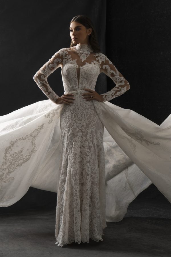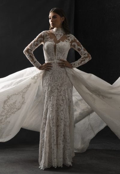 Regal and romantic, this sheath gown features exquisite Alençon lace from head to toe. The strapless, plunging sweetheart neckline elegantly frames the décolletage while the structured corset bodice sculpts the upper body. A row of fabric-covered buttons cascades into the beautiful lace train. Instantly elevate this classic bridal look with the gown’s high-neck, long sleeve, illusion lace bolero and matching, detachable overskirt.