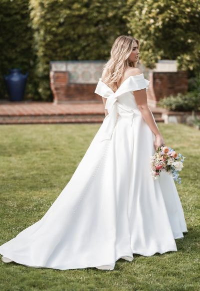 This strikingly simple satin ball gown beautifully frames the décolletage with its ruched, off-the-shoulder neckline. The intentionally-placed draping cascades into a structured bodice and melts into a full skirt. Best of all, a statement-making, abstract bow adorns the back bodice before flowing into an aisle-worthy train.