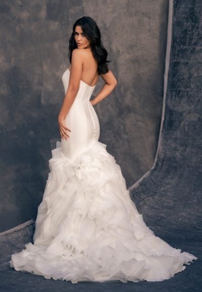 This statement-making mermaid gown features a strapless cut and plunging sweetheart neckline that elegantly frames the décolletage. Expertly crafted with silk Mikado fabric, the sleek design effortlessly sculpts the body before erupting into a voluminous, tiered, silk organza skirt. The dramatic design flows into an aisle-worthy train.
