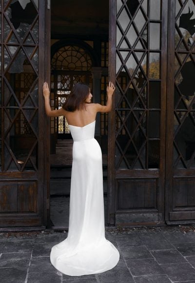 Sleek and refined, this sheath gown features a strapless cut and contemporary sweetheart neckline. Expertly crafted with satin fabric, the delicately pleated cups meet a corset bodice before cascading into a figure-skimming skirt complete with hand-placed draping and a high slit. To finish, a simple, circular-cut train completes this chic and timeless bridal look.