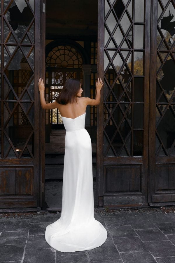 Style #RYLEEChic And Contemporary Satin Sheath Wedding Dress With Slit