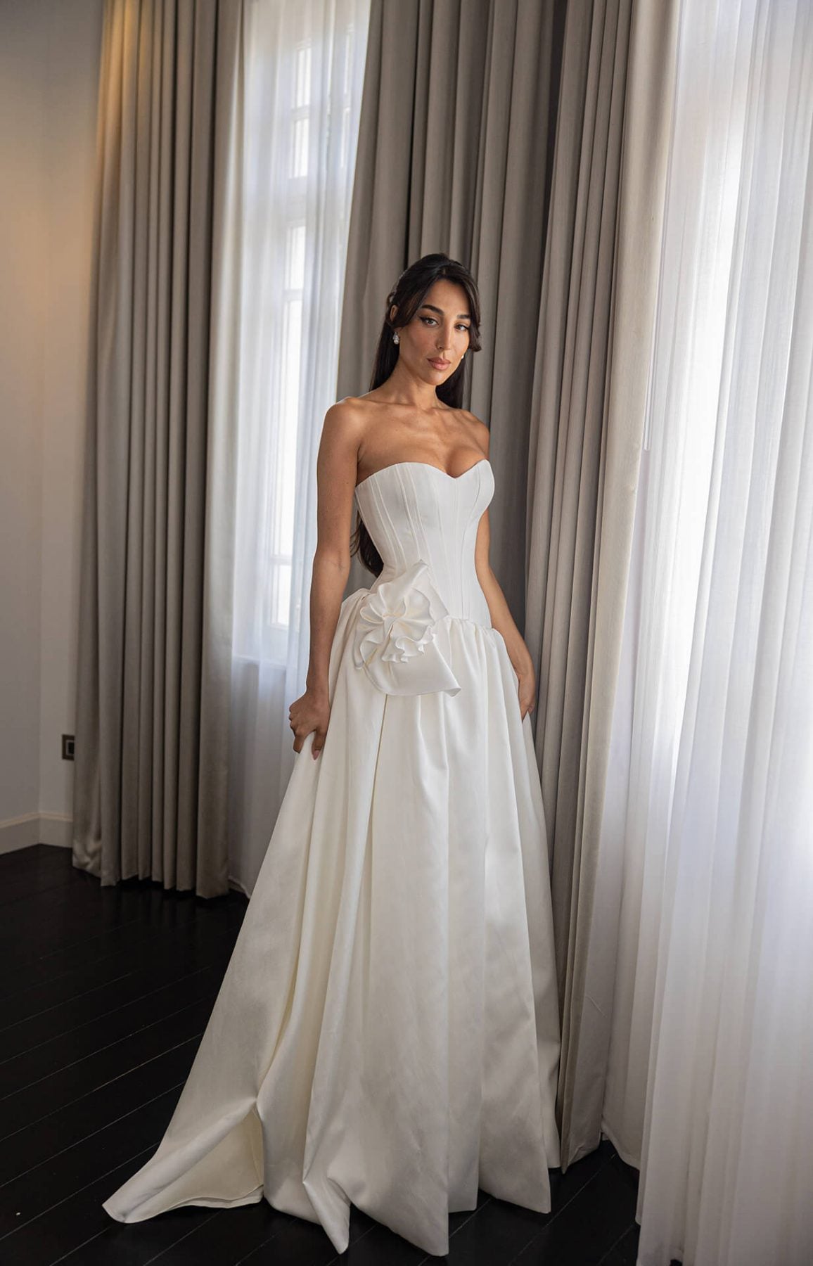 This figure-defining ball gown features a strapless cut paired with a sleek sweetheart neckline. Expertly designed with silk Mikado fabric from head to toe, the corset bodice defines the upper body with exposed boning before meeting an asymmetrical, dropped waistline. To finish, a three-dimensional floral appliqué creates a statement-making focal point before cascading into an effortlessly full skirt.