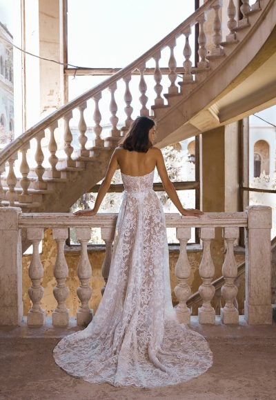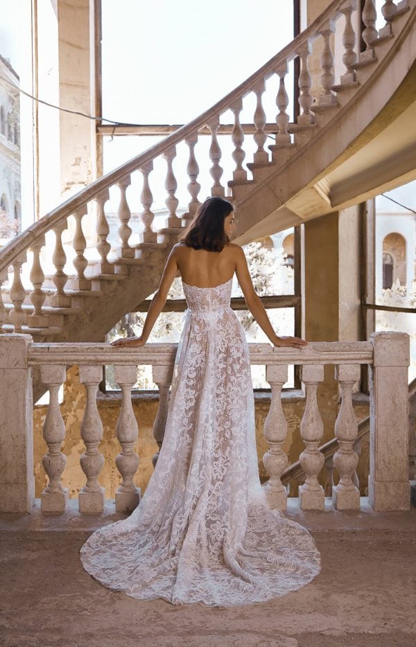Chic and romantic, this strapless A-line gown features an organically-cut sweetheart neckline that elegantly frames the décolletage. Exquisite floral embroidery adorns the structured bodice and sleek skirt complete with a leg-bearing slit. To finish, a subtle shimmer underlay adds unforgettable dimension while a three-dimensional floral appliqué at the waist elevates this modern bridal look.