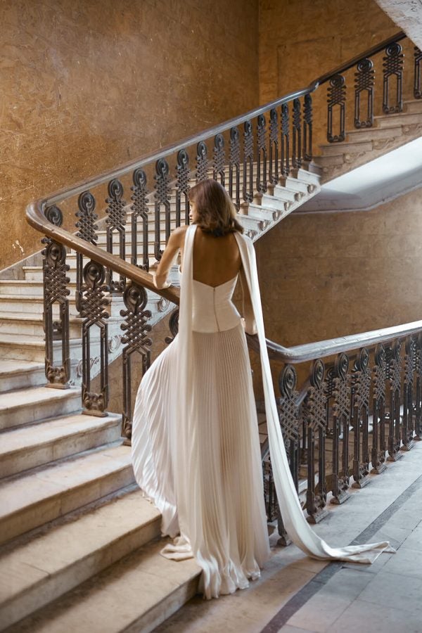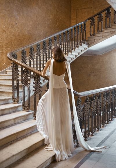 This effortlessly cool and elegant A-line gown features a modified sweetheart neckline and sleek strapless cut that pairs exceptionally with the gown’s neck scarf. Expertly crafted with silk, the corset bodice sculpts the upper body before cascading into a basque waistline. The uniquely-cut, scalloped trim meets a softly pleated, accordion skirt that melts into a minimal train.