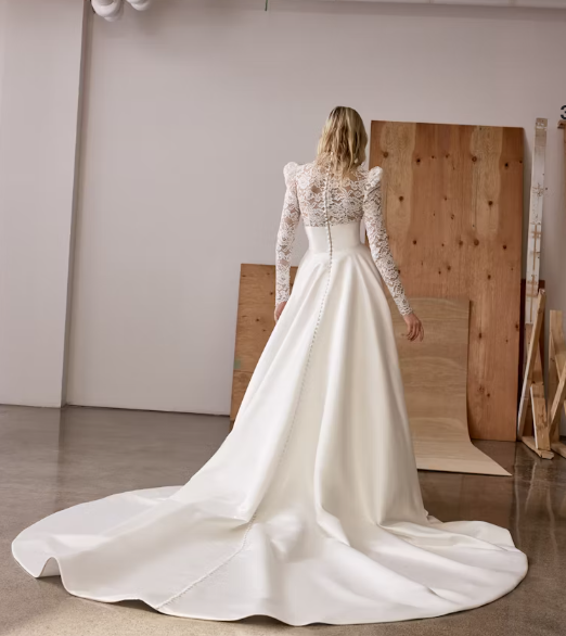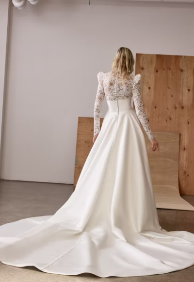 A modern spin on a traditional bridal look, this elegant ball gown features a high neckline paired with puffed, long sleeves expertly crafted with Alençon lace. The sheer bodice meets a wide, cummerbund detail that sits at the natural waistline before flowing into a full, pleated skirt crafted with a luxurious satin fabric. The high backline meets an endless row of fabric-covered buttons that cascade to the end of the cathedral-length train. Pockets and a structured horsehair trim complete this modest and classic bridal look.