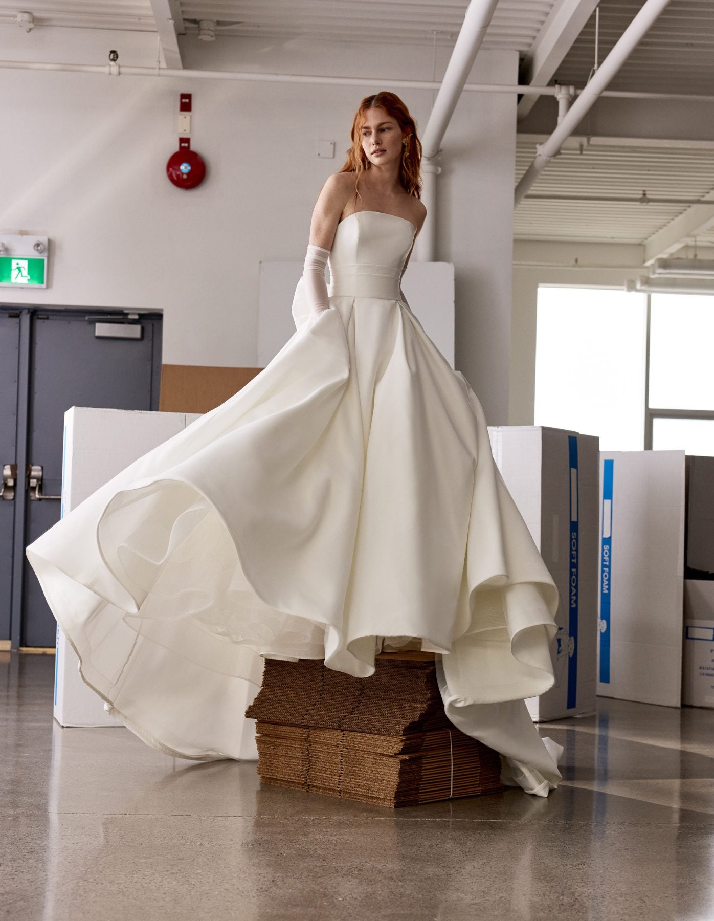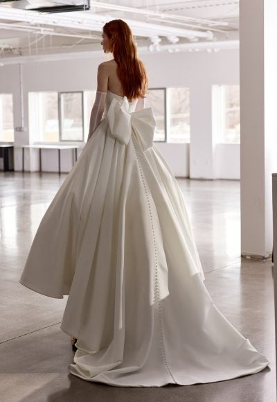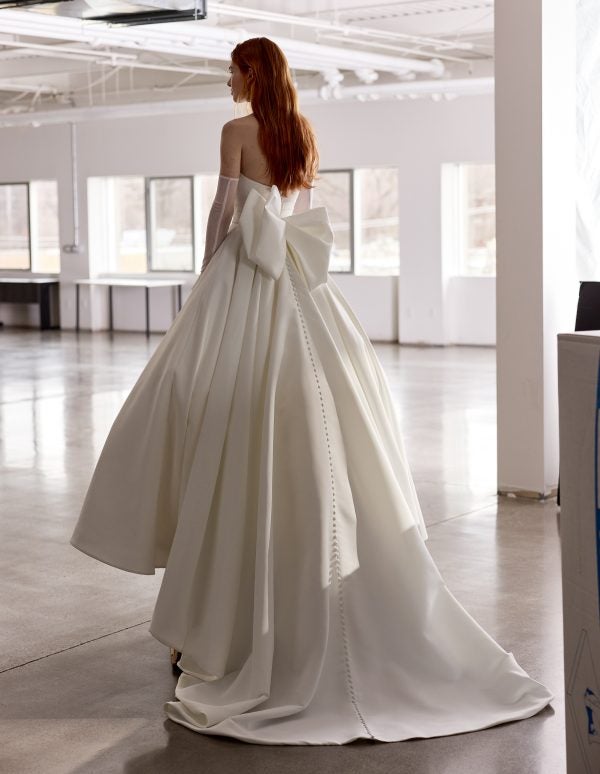 Impeccably crafted with matte satin fabric, this chic and simple ball gown is what minimalist’s dreams are made of. The strapless cut meets a sleek, crescent neckline and a structured bodice complete with a defined cummerbund along the waistline. The full, pleated skirt is complete with a dramatic bow and seemingly-endless row of fabric-covered buttons that cascade into an aisle-worthy train.