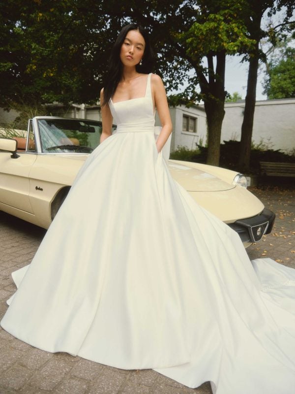 Style #CYNTHIASimple And Timeless Square-Neck Satin Ball Gown With Bow