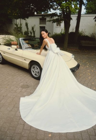 Sleek and timeless, this square-neck ball gown is meticulously crafted with matte satin fabric from head to toe. The expertly-tailored cut features illusion plunges under each arm and a breathtakingly open back complete with a statement-making bow. A pleated belt defines the waistline before flaring out into a dramatic skirt with pockets and train adorned with a row of fabric-covered buttons.