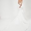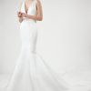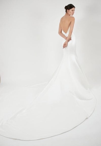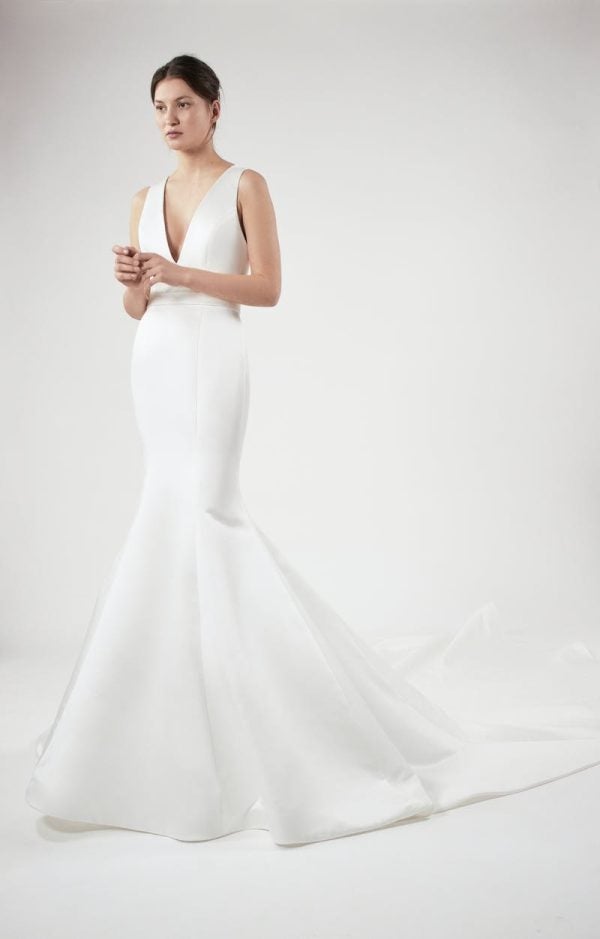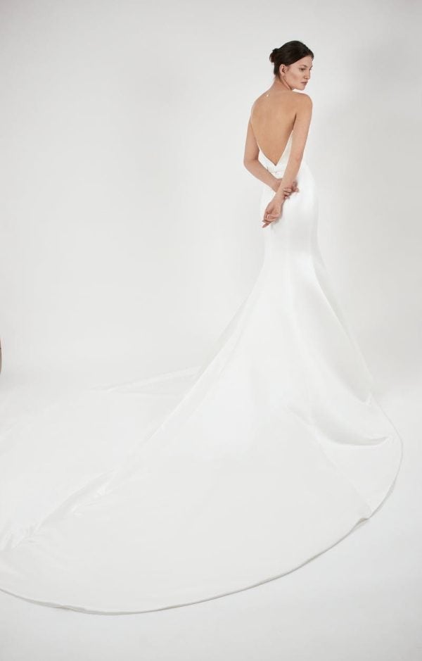 Satin fit and flare wedding dress with deep v-neckline, open back and belted waist.