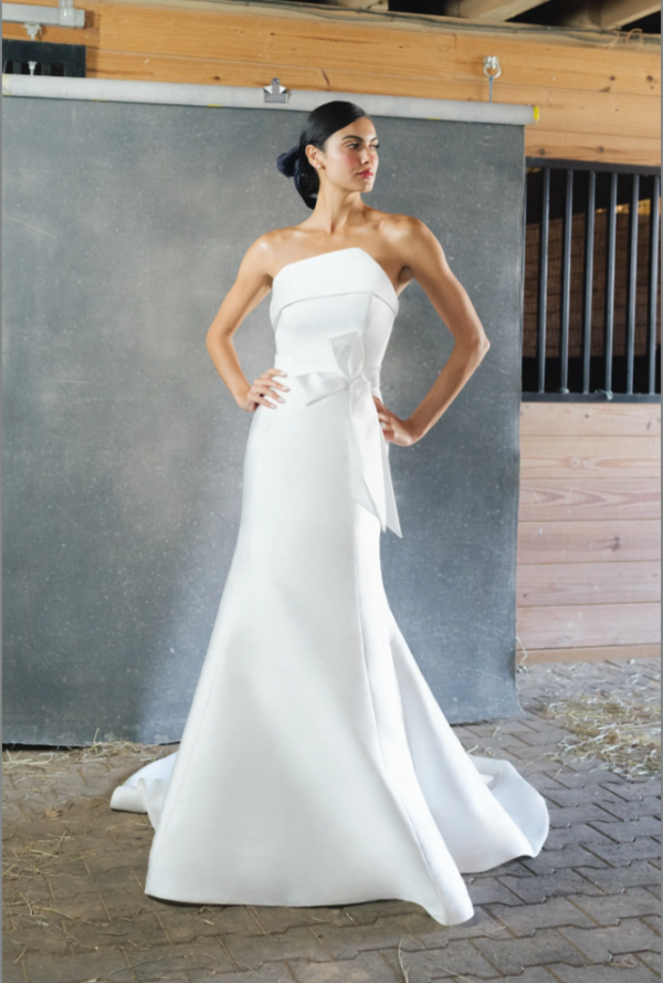 Turn heads in this strikingly chic trumpet gown. Crafted with luxurious scuba mikado, the strapless neckline features an asymmetrical cut that resembles a peak. The architectural detail is paired with a fold-over neckline before melting into a sleek bodice adorned with a bow along the waistline. The streamline silhouette effortlessly hugs the body before cascading [...]