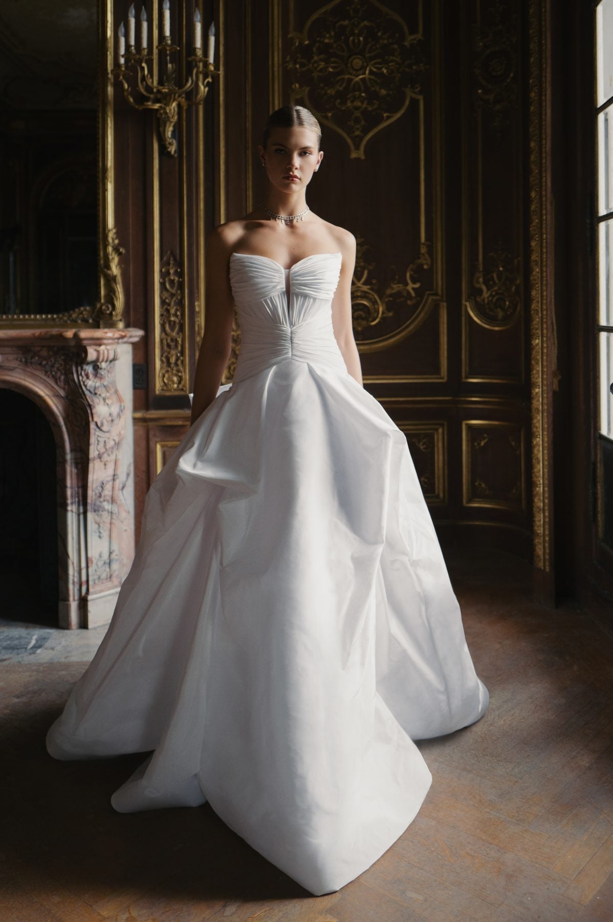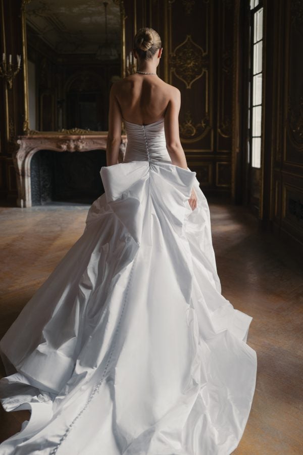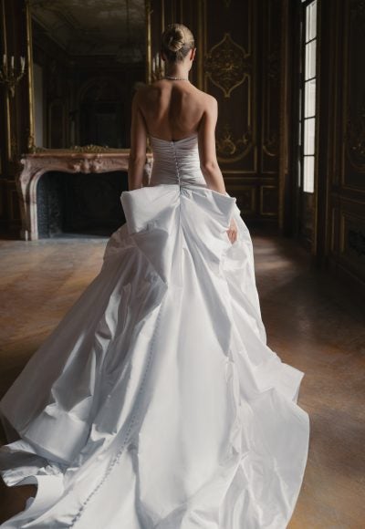 This exceptionally-designed ball gown is striking simplicity at its best. The strapless cut is paired with a pointed sweetheart neckline and an illusion plunge. Expertly crafted with silk Radzmir fabric, intricate pleating throughout the drop-waist bodice intentionally sculpts the upper body before erupting into a dramatic skirt adorned with pick-ups. To finish, an oversized bow and fabric-covered buttons complete this fashion-forward bridal look.