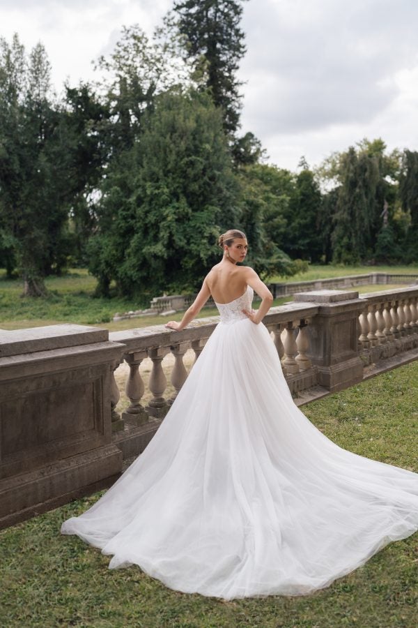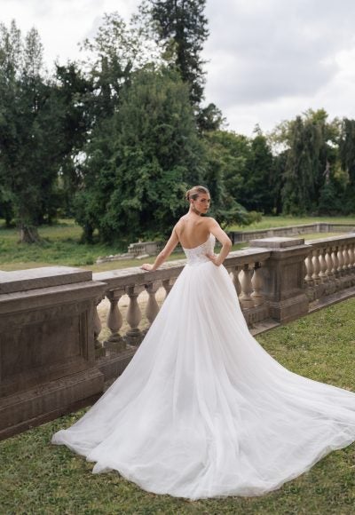 Float down the aisle in this fairytale-inspired ball gown. The strapless cut is paired with a sleek, cat-eye neckline that elegantly showcases the décolletage. Exquisitely adorned with delicate Alençon lace, the structured bodice falls to a dropped, basque waistline before erupting into a pleated tulle skirt. To finish, a dreamy tulle train completes this feminine [...]