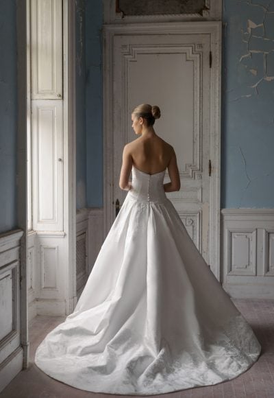 Chic and feminine, this breathtaking ball gown features a strapless cut that beautifully frames the décolletage before cascading into a sleek, dropped-waist bodice crafted with Duchess Satin Jacquard. The floral-inspired details cascade into the full, unadorned satin skirt complete with dramatic pleating and pockets. Fabric-covered buttons complement the back while more organic-inspired details complete the [...]