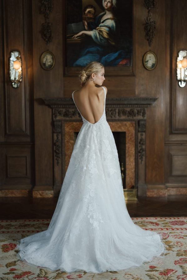 Radiating pure romance and elegance, this A-line gown features impeccable floral embroidery that cascades throughout soft tulle. The scoop neckline adds a minimal and modern element while the strikingly open back is bound to steal the show. Lightweight and effortless, a beautiful sweep train completes this ethereal bridal look.