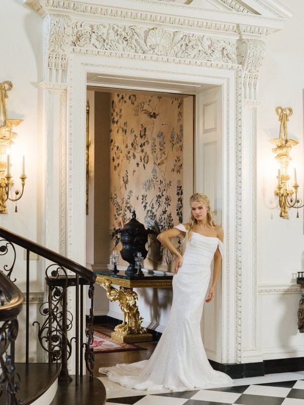 This beaded gown effortlessly cascades and sculpts the body with its intentionally draped bodice. The off-the-shoulder straps add a romantic touch while the gown’s seamless design offers movement and fluidity for an elegant and elongating bridal look.