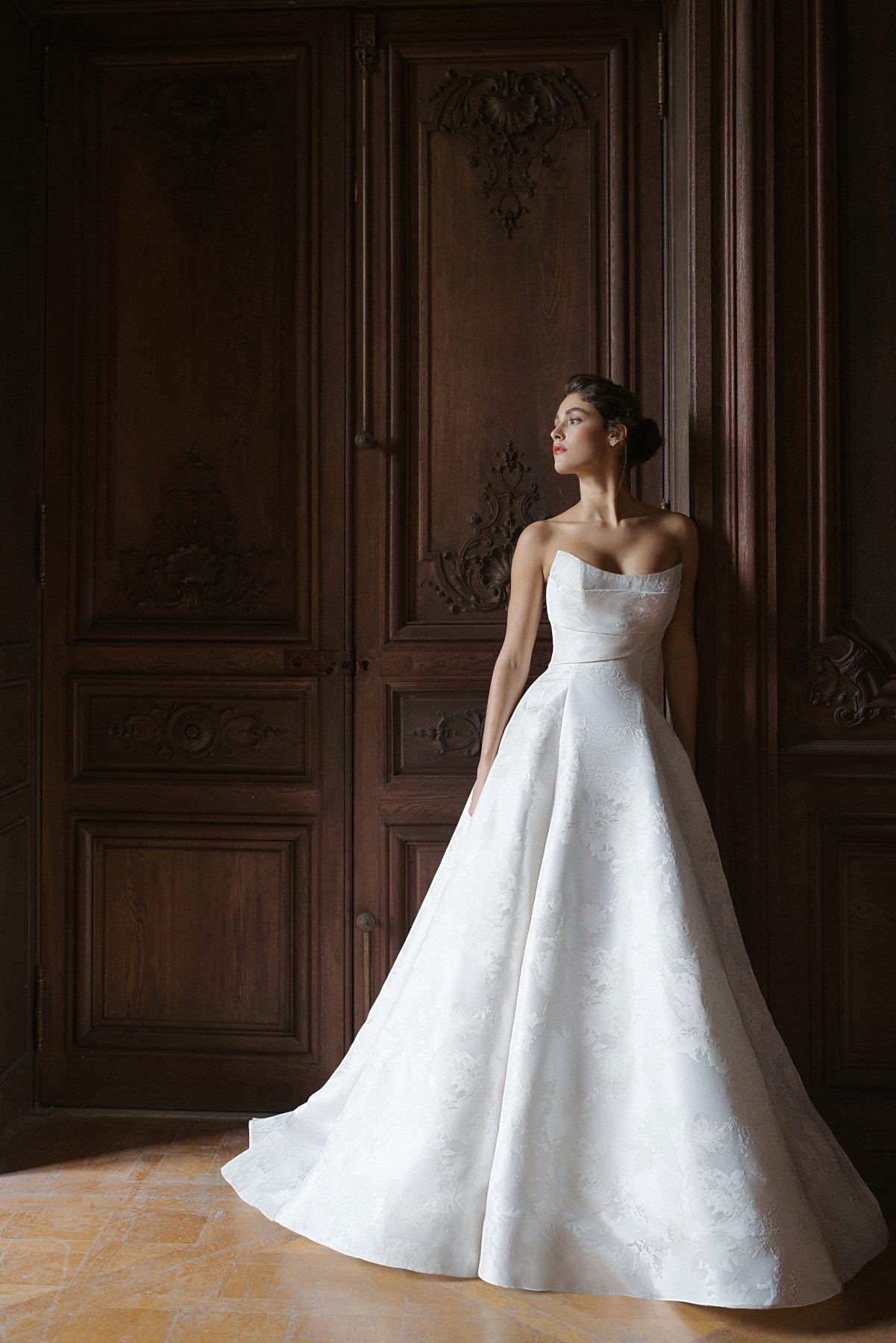 Chic and timeless, this striking A-line gown is expertly designed with peony-printed satin fabric that adds texture and dimension to this sleek bridal look. The strapless cut is paired with a cat-eye neckline before cascading into a hand-draped bodice. Finished with princess seams, the full skirt melts into a breathtaking train complete with a row of fabric-covered buttons.