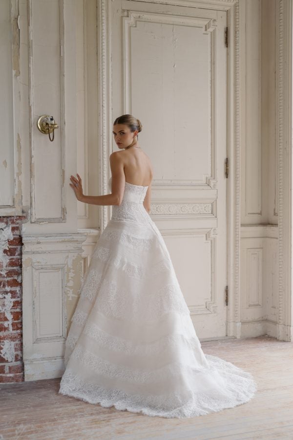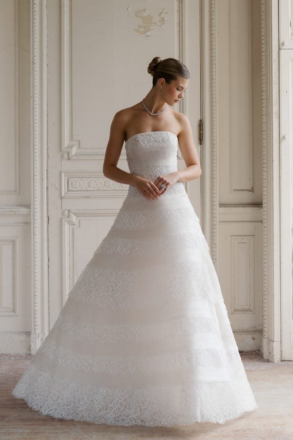 Feminine and flouncy, this strapless A-line gown features a straight-across neckline that elegantly frames the décolletage. A structured, drop-waist bodice defines the upper body before flaring out into a sleek yet full skirt. Intentionally designed with alternating tiers of silk organza and exquisite corded lace, the undeniably unique pattern adorns the entirety of the soft silhouette before cascading into a scalloped hem.