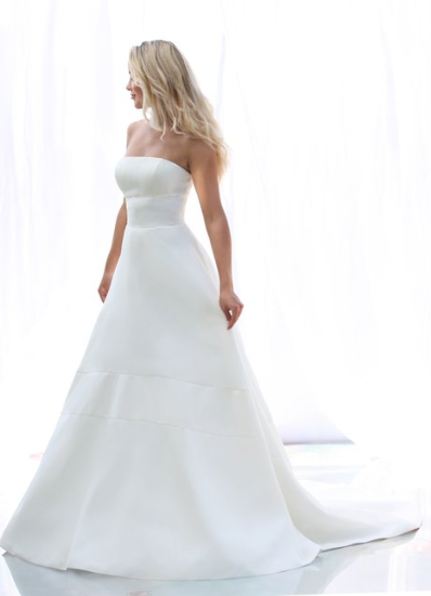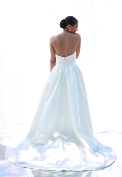 Chic and timeless, this satin ball gown showcases a strapless cut and straight, fold-over neckline that elegantly frames the décolletage. The sleek bodice falls to a natural waistline complete with a polished, bow-adorned belt. Simple yet stately, the full, pleated skirt is paired with an endless row of fabric-covered buttons that flows into a beautiful train.