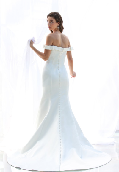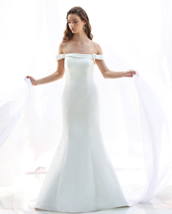 Style #GEORGIANAClassic Off-The-Shoulder Satin Fit-And-Flare Wedding Dress With Bows