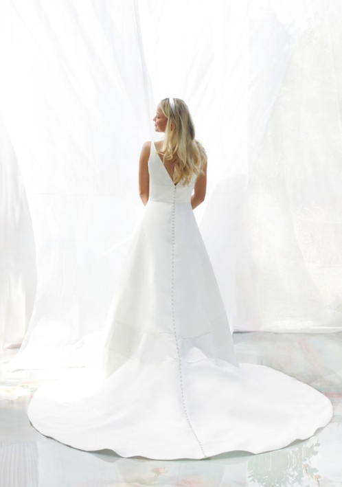 Classic and elegant, this A-line gown is expertly crafted with Silk Mikado-Organza fabric. The plunging V-neckline showcases the décolletage before meeting a sleek bodice complete with a Duchess Satin cummerbund detail. A full, circle-cut skirt cascades from the natural waistline and is adorned with another banded, Duchess Satin detail that runs horizontally. To finish, the open back is paired with an endless row of fabric-covered buttons that flows to the end of the chapel-length train.