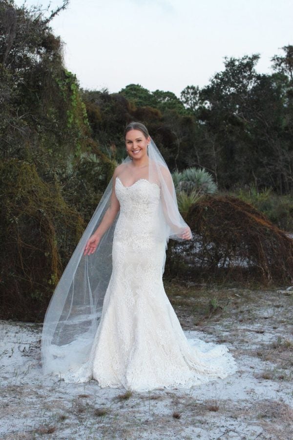 Strapless lace fishtail gown with a scallop trim on neckline and hem with inner lace up corset and buttons down the back to end of train.