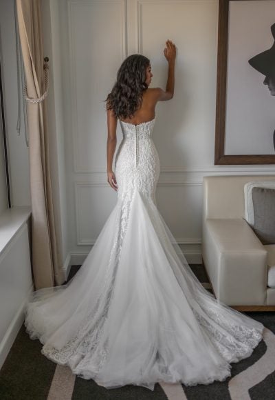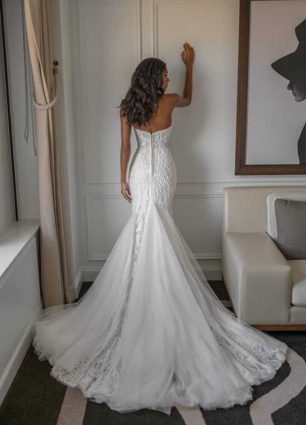 Romance meets drama with this striking fit-and-flare gown. Featuring a strapless cut paired with a classic sweetheart neckline, the corset, bustier-style bodice showcases intentionally-placed sheer details, exposed boning, and beaded appliqués that cascade throughout the figure-hugging silhouette. Fabric-covered buttons along the backline add an elegant and timeless element. Best of all, tulle godets exude a dreamy yet dramatic aesthetic before melting into an aisle-worthy train.