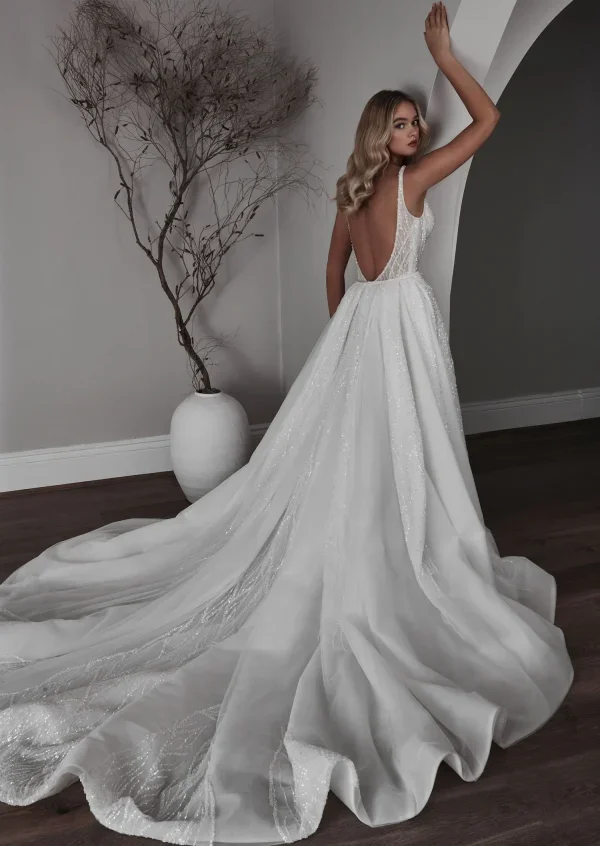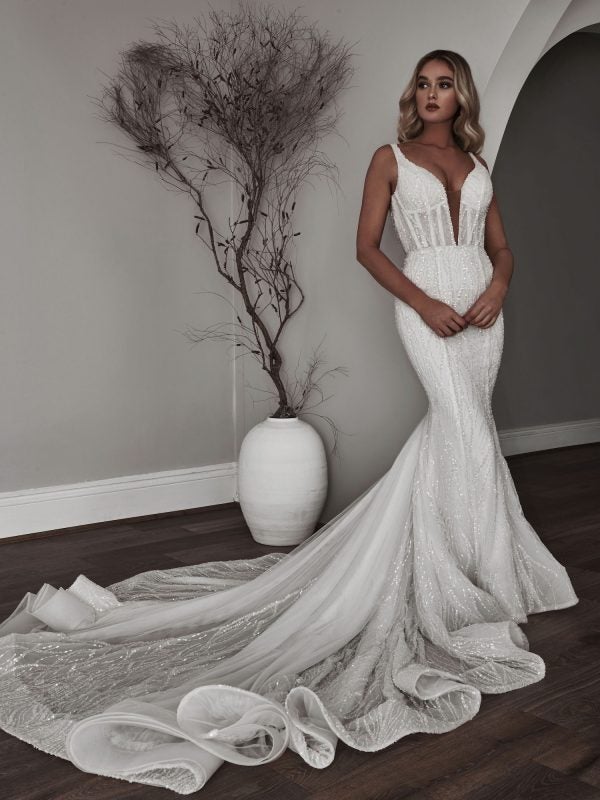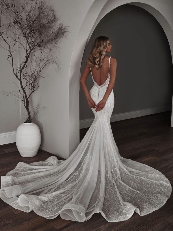 This glamorous and sexy fit-and-flare gown features a striking V-neckline and an illusion plunge that frames the face and elongates the body. It’s paired with a daringly low and open back that melts into a row of fabric-covered buttons. The sheer bodice features exposed boning that effortlessly sculpts the upper body before cascading into a figure-hugging silhouette fully adorned with exquisite beading. To finish, tulle godets add a soft and romantic element to the aisle-worthy train.