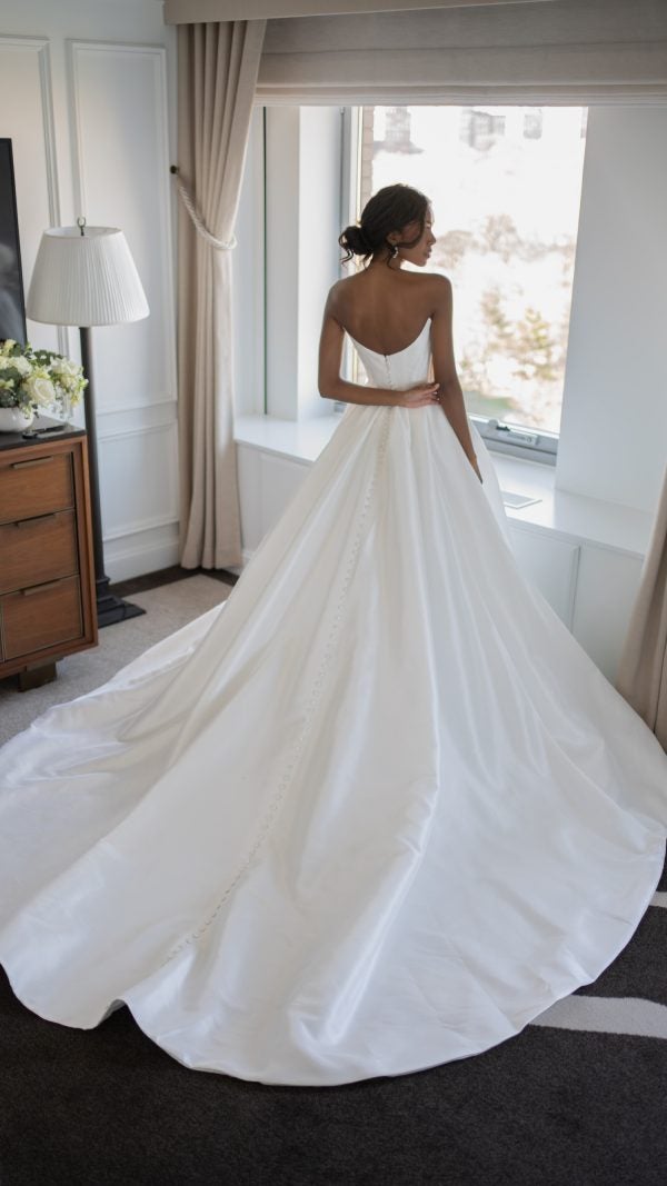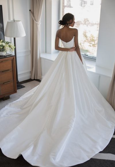 Equally timeless and modern, this strikingly simple ball gown features a strapless cut paired with a contemporary sweetheart neckline. Crafted with silk Mikado fabric, delicately-ruched cups meet a waist-defining corset bodice before cascading into a full skirt with box pleating and an optional leg-bearing slit. The dramatically-scooped backline is complete with fabric-covered buttons that melt into a grand, cathedral-length train.