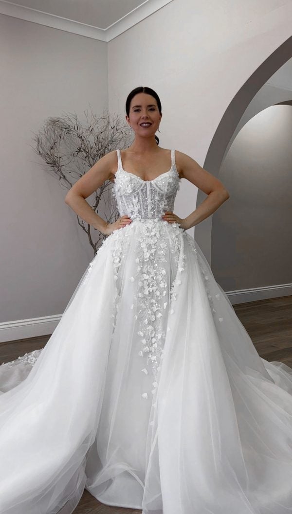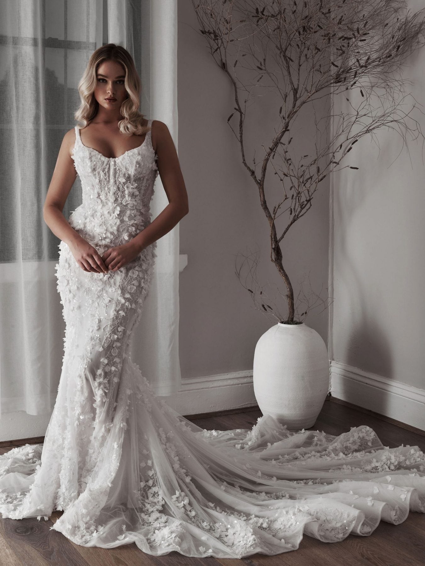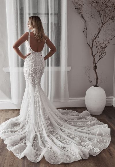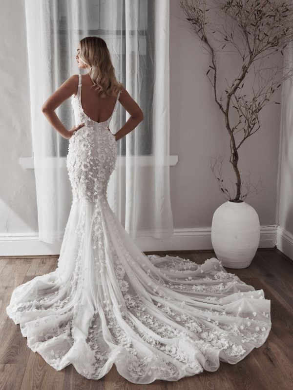 Showcasing unforgettable texture, this figure-hugging gown features thin straps that melt into a subtle sweetheart neckline and breathtakingly open back complete with a row of fabric-covered buttons. The sheer corset bodice sculpts the upper body while exquisite beading and three-dimensional floral appliqués flurry throughout. The equally-embellished, aisle-worthy train completes this grand yet romantic bridal look.