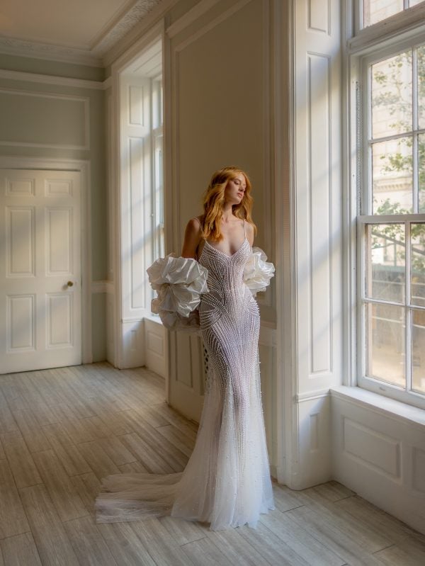 Style #5151Chic and Modern Pearl Embellished Fit-and-Flare Wedding Dress
